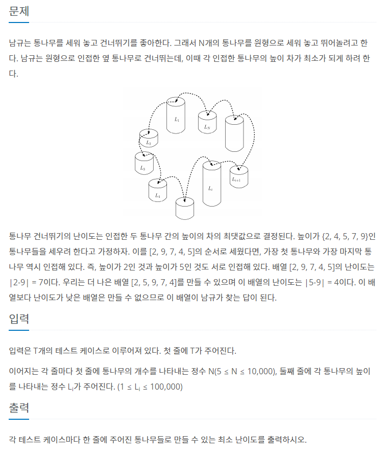 남규는 통나무를 세워 놓고 건너뛰기를 좋아한다. 그래서 N개의 통나무를 원형으로 세워 놓고 뛰어놀려고 한다. 남규는 원형으로 인접한 옆 통나무로 건너뛰는데, 이때 각 인접한 통나무의 높이